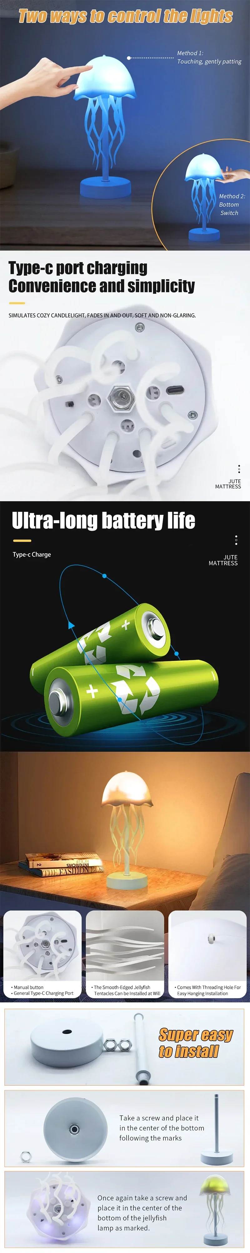 Our Rechargeable Hanging Floating Jellyfish Lamp It's versatile enough to be used as ambient lighting for nightstands, coffee shops, bars, and provides long-lasting illumination. outdoor adventure. Create a delightful glow in any environment, from the bedroom to camping trips
