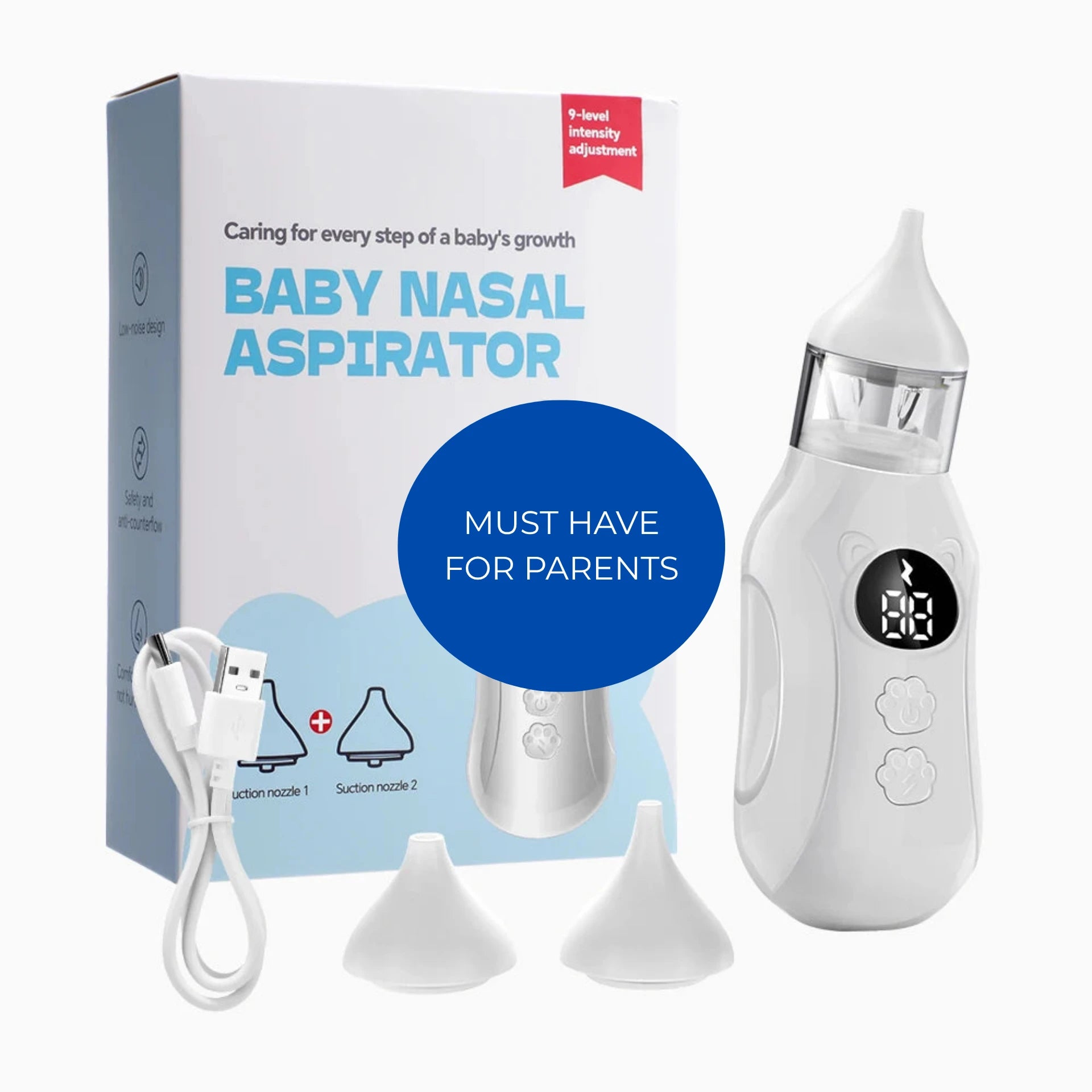 This 9-speed, whisper-quiet device is designed to clear your baby’s nose in seconds — without tears or discomfort. Its gentle suction power adapts to your baby’s needs, while soft, medical-grade tips ensure safety and comfort. Easy to clean and portable, it's the modern solution every parent needs in their nursery kit.
